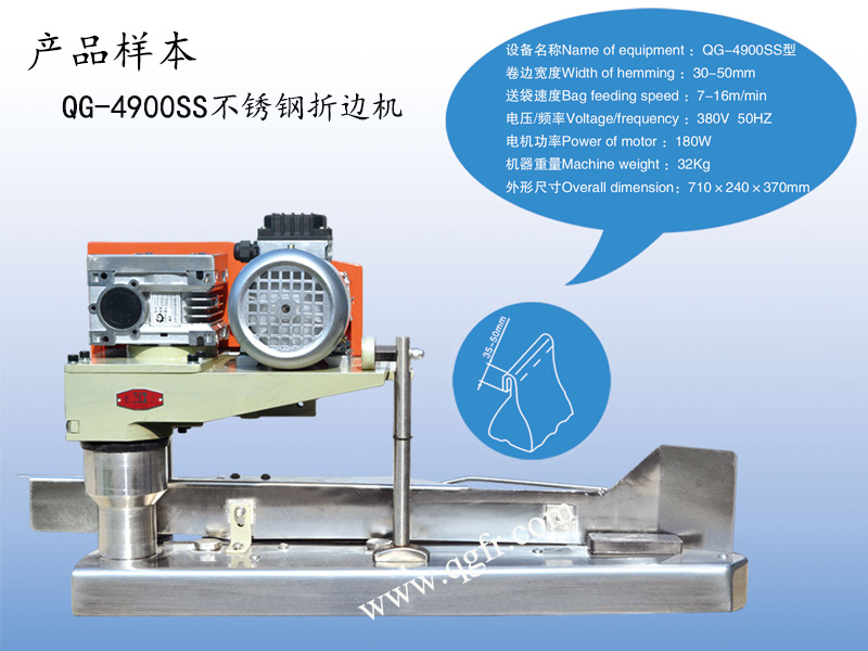 QG4900(SS) bags feed-in device QG4900 bags feed-in device is used to feed the filled bags into the sewing machine and fold over the bag top. This model is used together with the GK series automatic bag closing sewing machines.