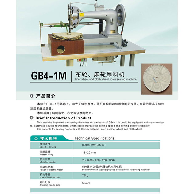 GB4-1M Linen Wheel Sewing Machine: adopts single needle oscillating shuttle to form lockstitch. The maximum sewing thickness can be 25 mm. Patent oversize oscillating shuttle is incorporated. It could be equipped with synchronizer for automatic sewing round plate, which could improve the sewing speed and sewing quality efficiently.