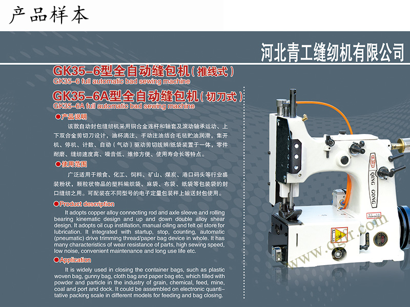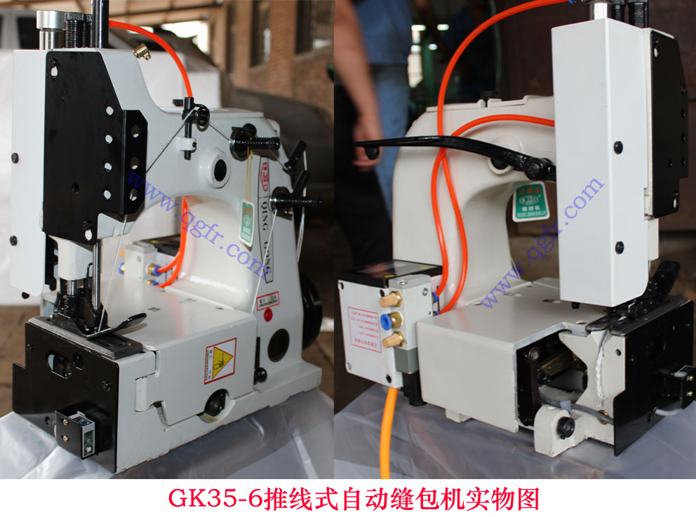 c.GK35-6AF型反方向自動縫包機,在GK35-6A自動縫包機基礎上開發的一種新型反方向縫包機。該機可以與GK35-6A型正機相配合,在同一立柱上在兩側同時縫合袋口。