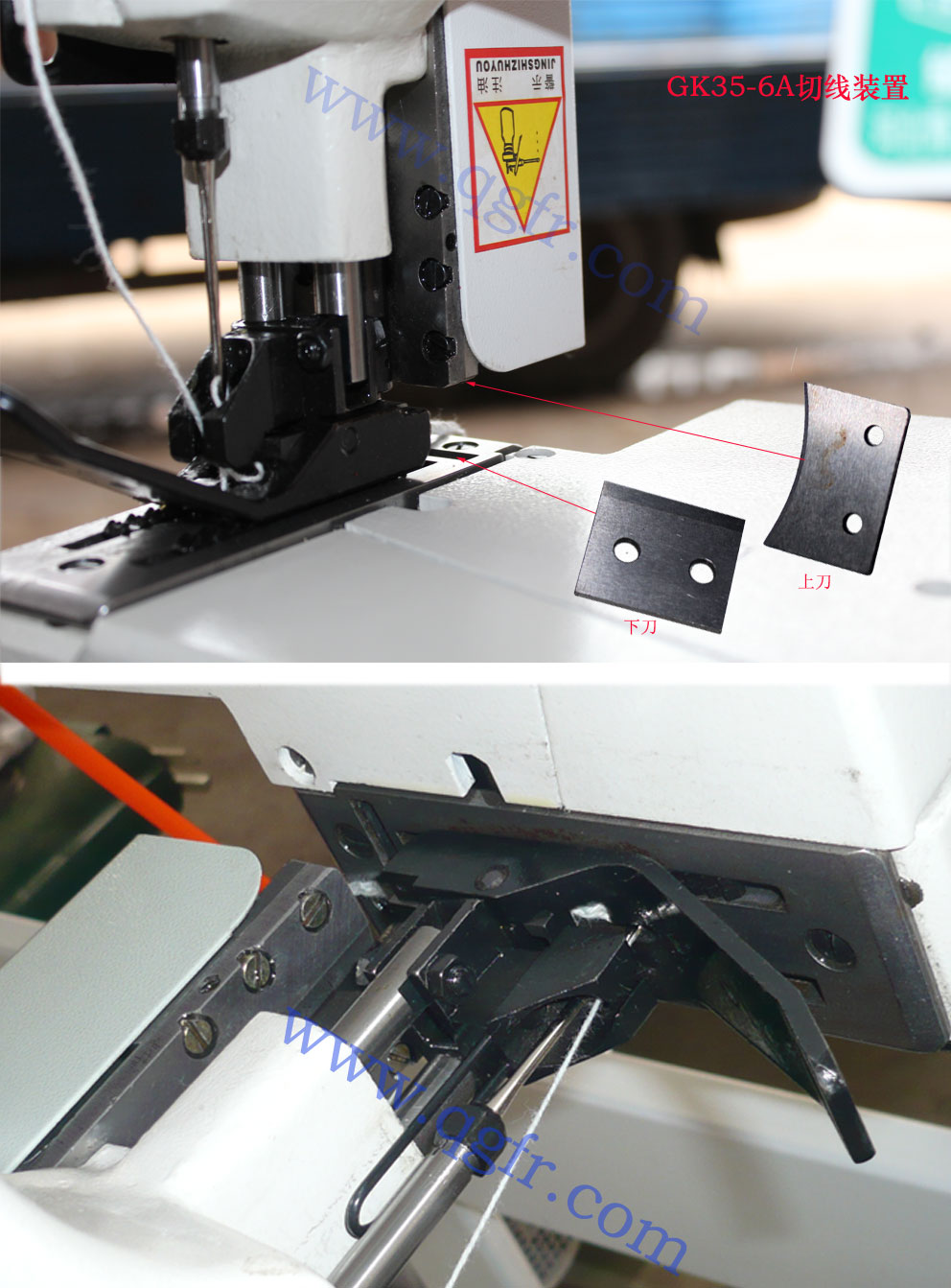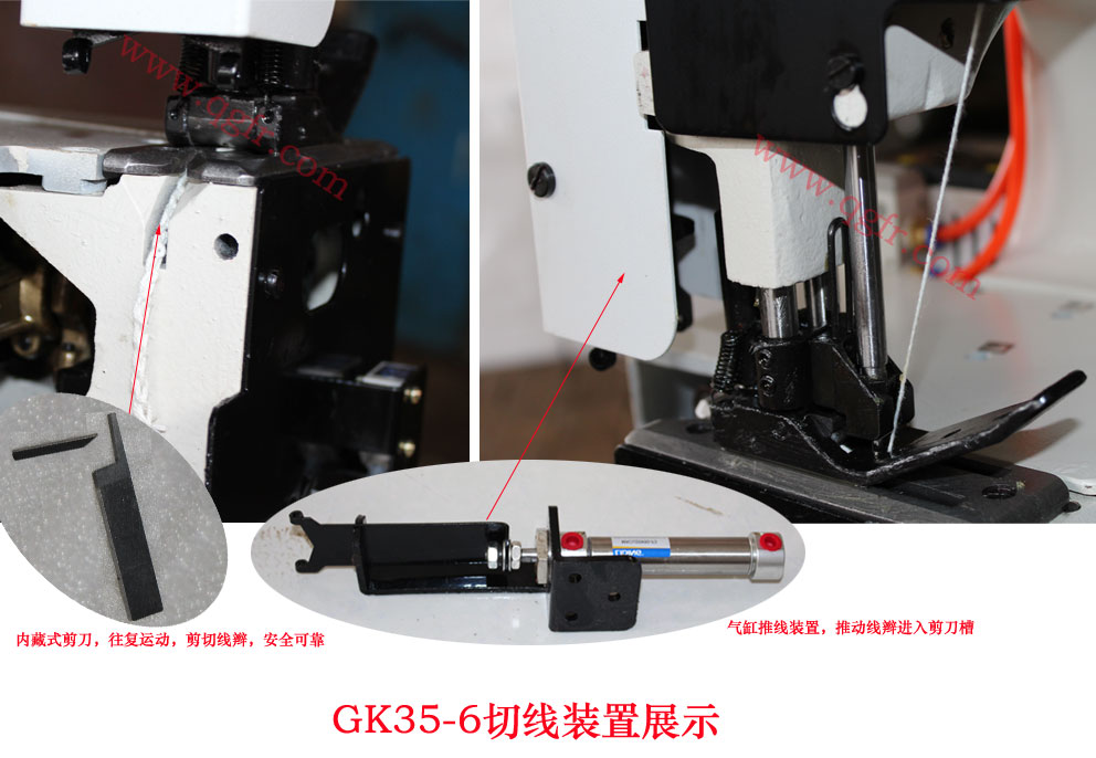 b.GK35-6A型全自動縫包機,采用切刀式結構,在氣缸推動下,上刀與下刀配合完成切線動作,切線更加可靠,而且能夠同時切斷皺紋紙等。