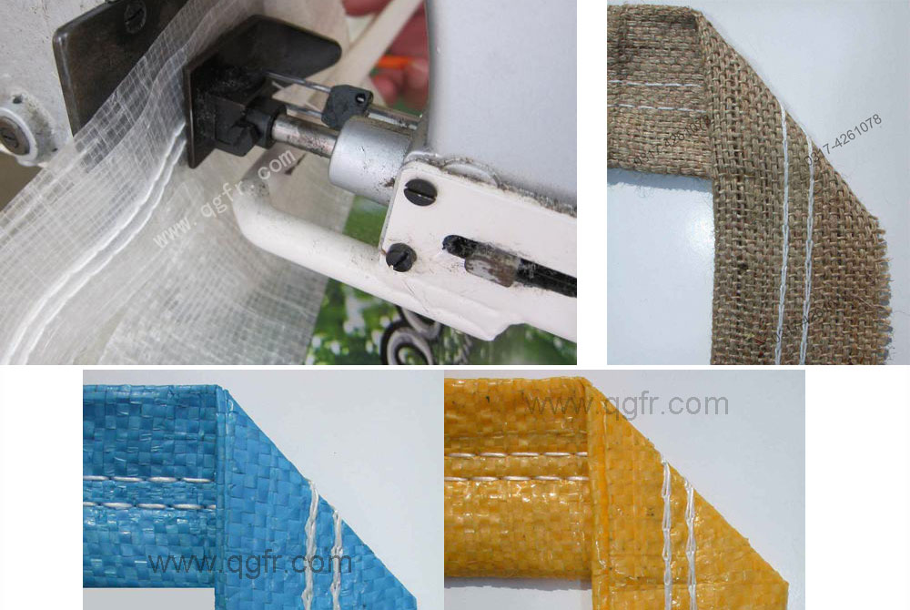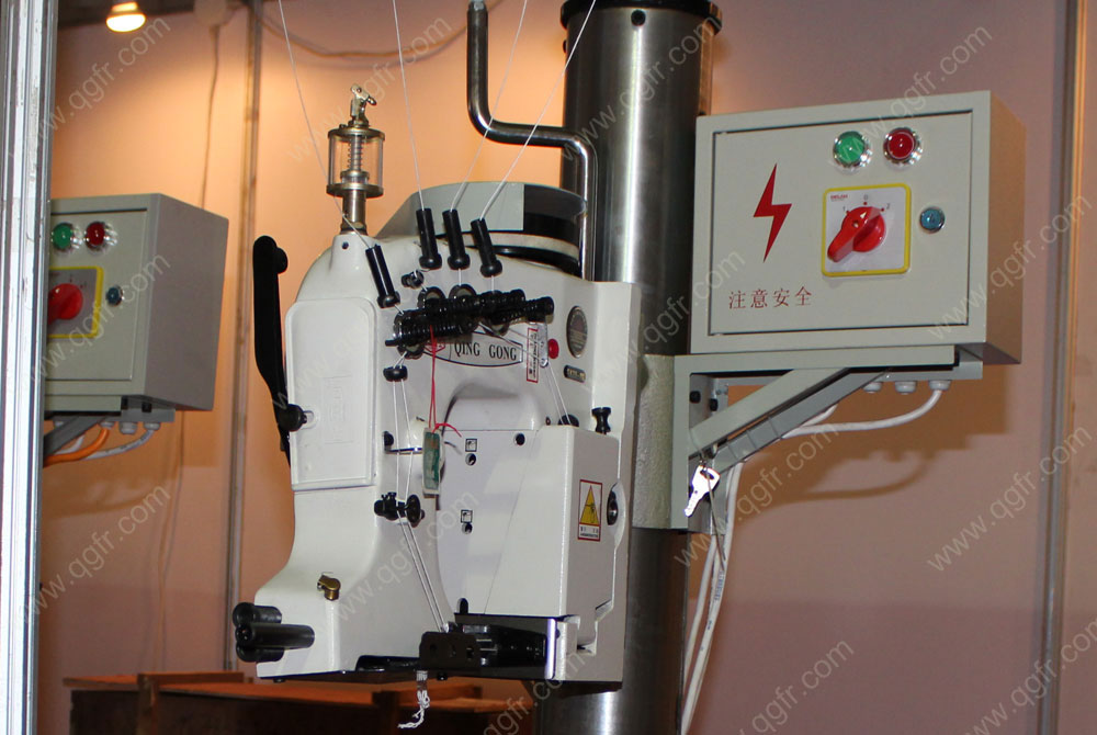 工作過程:裝配在輸送機上,當(dāng)裝滿物料的編織袋到達離縫包機10厘米處,在光控開關(guān)控制下縫包機自動啟動,縫合袋口,縫好每一袋時,切刀自動剪斷線辮,縫包機自動停機。