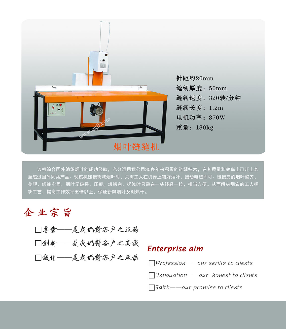 該機綜合國外尤其是巴西編煙機的成功經驗,充分運用我公司20多年來積累的鏈縫技術,在編煙質量和效率上已經趕上并超過國外同類產品,改變了以往國內綁煙葉的人工作業方式,大大的減輕綁煙工人的勞動強度,提高勞動效率,保證新鮮煙葉及時烘干。與其他形式的編煙機相比,該編煙機的綁線牢固美觀,煙葉無壓痕、無破損;采用單線鏈式線跡,不僅節約用線成本,而且拆煙十分方便快捷。