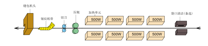 袋口清潔(備選)→切刀:修整袋口→內袋熱封(4組加熱塊加熱:聚四氟乙烯封口帶使加熱塊與袋子不直接接觸,以保護袋子外表不與加熱塊粘連)→壓輥壓合→皺紋紙帶→縫包機:外袋縫紉.